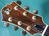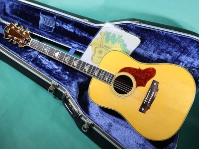エレキギターのブランドとして知られるB,C,RICHは、1960年代中期に「BERNARDO CHAVEZ RICO」によってロサンゼルスでギターを制作する工房から始まりました。 当時のフォーク音楽の流行もあって、1960年代後期にはブランド名をB,C,RICHとして本格的にアコースティックギターを制作販売しています。 1974年に発表したモッキンバード、イーグル、ビッチと言った独創的なデザインのエレキギターが大人気となり、アコースティックギターは1970年代後半には生産終了して、エレキギターメーカーとして世界中で人気となりました。 今回の楽器は、1970年代中期に制作されたハンドメイドによる楽器で、1978年のカタログに掲載されているモデルです。 後期モデルならではの個性的なデザインのヘッド、ブラジリアンローズウッドを採用した、豪華スペックです。 立ち上がりの良い艶やかでパワフルな箱鳴りサウンドで、暖かみを感じさせる豊かな響きです。 滅多に見ることの出来ない超稀少モデルです。 当時、日本にも輸入されていましたが、大変高価だったこともあり、数はほとんど売れてはいなかったようです。 トップはジャーマンスプルース、サイド、バックはブラジリアンローズウッドで3ピース、エボニー指板、エボニーブリッジです。 ヘリングボーンバインディング、アンダーフィニッシュ鼈甲色ピックガードで、ポジションマークは雲形のアバロンインレイです。 ペグはグローバー102ゴールドで、動作はスムーズです。 ナット交換、リフレット擦り合わせ調整、サドル交換と言った消耗パーツのメンテナンスがしっかりとされています。 内部ブレイシング構造は、マーチンタイプのXブレイシングですが、独自のパターンのトーンバー構造で、手工制作の楽器ならではの緻密な作り込みで制作されています。 ピカピカで大変綺麗な状態ですが、トップ向かって右下に割れの補修があります。指板セルのチップ箇所もあります。 ナット部幅43.0ミリ程度のやや太目レギュラーグリップネックです。アジャストロッドはしっかりと効いていて余裕があります。 12フレット上で6弦2.2ミリ、1弦1.6ミリで、弾き易くハイポジションまでバランスの良いセッティングです。 サドルの高さにはほとんど余裕はありませんが、さらに下げる場合アジャストロッドを締めることでもう少し下がります。 とは言え、今でもかなり低いですので、これ以上低くしすぎるとせっかくの立ち上がりの良いしっかり感のあるトーンがスポイルされると思います。 バリッと明るく立ち上がりが良く、パワフルに鳴ります。 粒立ちがハッキリとしていて、軽快感のあるトーンでいて、低音の豊かな量感もあり、バランスの良い鳴りの良い楽器です。 乾いた感じでレスポンスが良く、はっきりとした煌びやかなトーンで華やかに鳴ります。 マーチンほどの繊細な艶やかさではありませんが、メリハリ感のあるパワフルな立ち上がりのサウンドで、ハカランダらしい芯のある鳴りが良い感じです。 軽いフィンガータッチのプレイからダイナミックなストロークまで、音に表情があって楽しめる楽器です。 当時の専用ハードケース付きです。 たぶん、次に目にするチャンスはほとんど無いと思える超希少モデルです。 B C RICH B 300D 1970s 動画紹介! 出張買取はじめました!お気軽にご相談ください! |