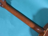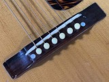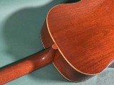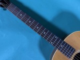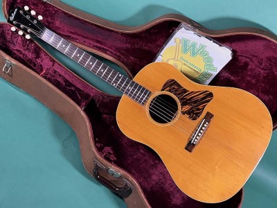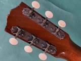 圧倒的なレスポンス感、枯れた荒っぽい大味な鳴りでいて繊細な粒立ちの良いトーン、プリウォーギブソンビンテージならではの魅力いっぱいの綺麗な楽器です。 J-35はJUMBO-35の略で、1934年にマーチンD-18に対抗して企画発売されたJUMBOの後継モデルとして、1936年から発売されました。その後1942年にはJ-45となり、現在まで世界中で愛用されるベストセラーモデルの元となった楽器です。 ラウンドショルダーデザインのボディー、大味で荒っぽい鳴りでいて芯のしっかりとしたトーンが特徴で、特に今回の1940年から42年の2トーンバーモデルは、野太いレスポンス感があり、ピアノのような豊かなトーンが特徴です。 特にナチュラルブロンドフィニッシュの楽器は数が少なく、滅多に入手出来ない大変貴重な楽器です。 トップはアディロンダックスプルース、サイド、バックはマホガニー、ハカランダ指板、ハカランダブリッジです。 ナットはオリジナル同様のエボニー製、サドル交換、オリジナルに近い細くて低めのフレットでリフレット済みです。 ペグはオリジナルオープンバックでノブのみ交換してあります。トルクムラがありますが実用的にはまだ問題ありません。 渋い色合いに焼けていて細かくウェザーチェックが入り、それなりにキズも多少はある貫禄があるルックスですが、この年代の楽器としては大変綺麗なほうだと思います。 サウンドホール端上指板近くに一ヵ所、ピックガード1弦下に一ヵ所のわずかなヘアラインクラックの補修がありますが、全体には大きな修理履歴も無く、素晴らしいコンディションです。 ナット部幅42.5ミリくらいで、太いラウンドシェイプネックです。 アジャストロッドはしっかりと効いていて余裕があります。 12フレット上で6弦2.4ミリ、1弦1.7ミリ程度で、低めで弾き易いと思います。 圧倒的なレスポンス感のある豊かで、枯れたこなれた箱鳴りサウンドです。 ストロークでのパワフル感のあるサウンドはもちろん、フィンガーピッキングでも粒立ちが良く良い感じです。単音でのソロのフレーズも音が前に出る感じで、この時代のビンテージならではの存在感です。 2トーンバーらしい、豊かな低音でいて芯のあるサウンドです。 もともと数の少ない楽器で、これだけの良い状態で入手出来るチャンスはなかなか無いと思います。 かなり高額とは言えマーチンD-18の同年代のものの半額程度の価格はまだまだ魅力ですね。 古いブラウンハードケース付きです。 GIBSON J 35 NT 1941 動画紹介! 出張買取はじめました!お気軽にご相談ください! |